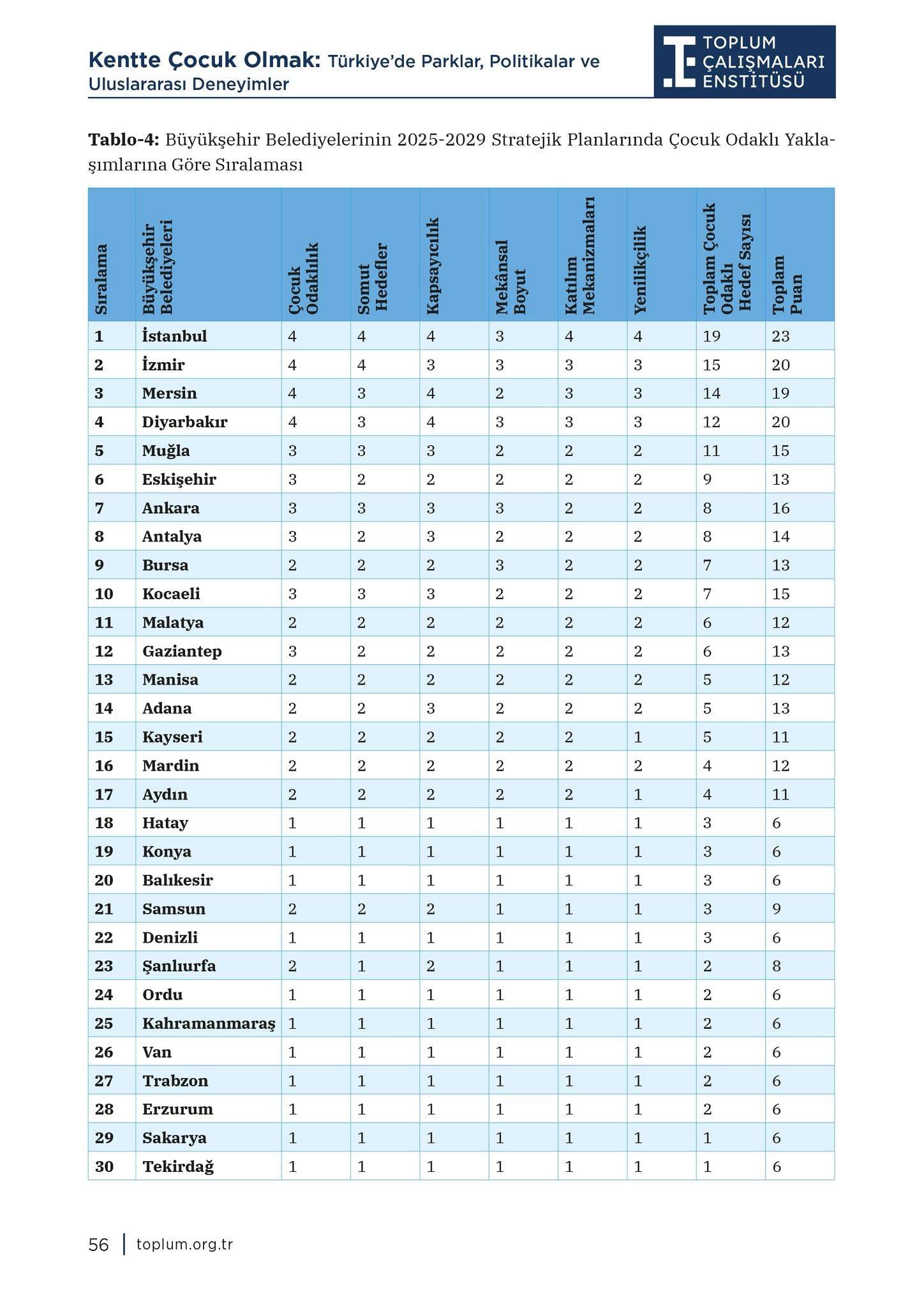 Balıkesir, Denizli, Erzurum, Hatay, Kahramanmaraş, Konya, Ordu, Sakarya, Şanlıurfa, Tekirdağ, Trabzon ve Van büyükşehir belediyeleri ise en düşük puanı alan kentler arasında yer aldı. Bu belediyelerin stratejik planlarında çocuklara yönelik somut hedeflerin bulunmadığı, çocukların kent politikalarında edilgen bir unsur olarak ele alındığı ifade edildi.