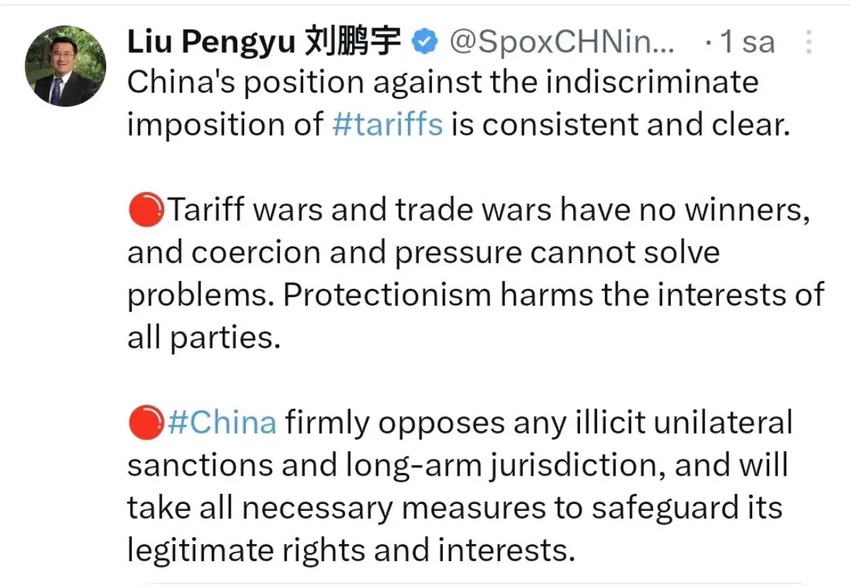 Çin’in ABD Büyükelçiliği Sözcüsü Liu Pengyu, sosyal medya platformu üzerinden yaptığı açıklamada ülkenin gümrük vergilerine yönelik tutumunun tutarlı ve net olduğunu vurgulayarak, “Gümrük vergisi savaşlarının ve ticaret savaşlarının kazananı yoktur, zorlama ve baskı sorunları çözemez. Korumacılık tüm tarafların çıkarlarına zarar verir” dedi.