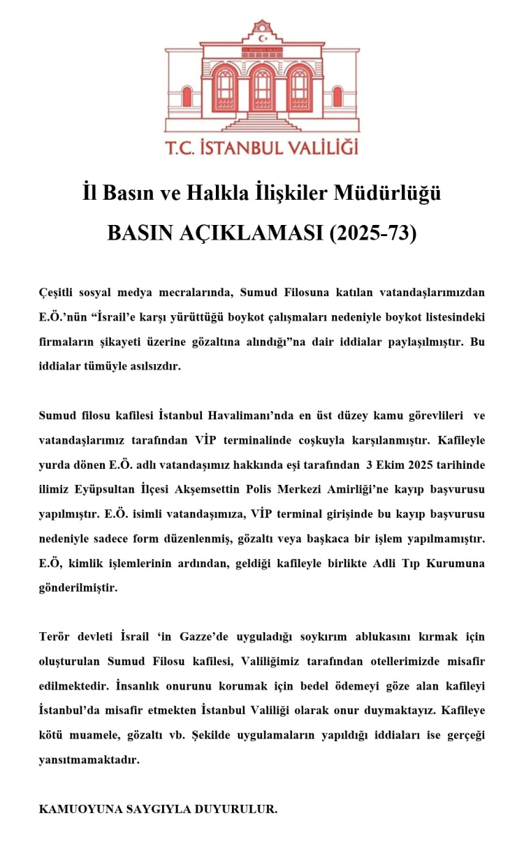 Küresel Sumud Filosu’na insani yardım taşıyan Türk vatandaşı E.Ö.’nün, İsrail’e karşı boykot çalışmaları nedeniyle boykot listesindeki firmaların şikayeti üzerine gözaltına alındığı iddiaları asılsız çıktı. Valilik, Sumud Filosu kafilesinin İstanbul Havalimanı VIP terminalinde en üst düzey kamu görevlileri ve vatandaşlar tarafından coşkuyla karşılandığını belirtti.