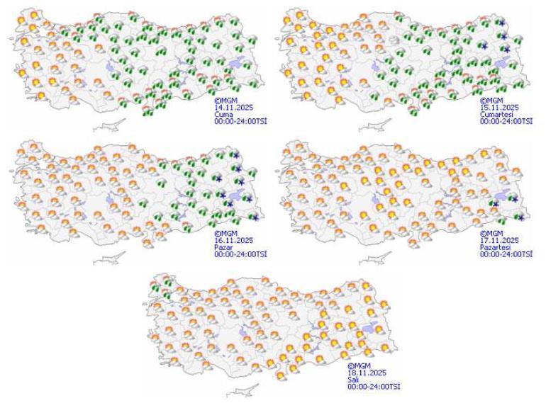 Meteoroloji Genel Müdürlüğü tarafından yapılan tahminlere göre: Ülkemiz genelinin parçalı ve çok bulutlu, Marmara’nın doğusu, Doğu Akdeniz, İç Anadolu’nun doğusu, Karadeniz, Doğu Anadolu’nun kuzey ve batısı ile Güneydoğu Anadolu çevrelerinin yağmur ve sağanak yağışlı, Doğu Karadeniz’in iç kesimlerinin yüksekleri ile Doğu Anadolu’nun kuzey kesimlerinin yükseklerinin karla karışık yağmur ve yer yer kar yağışlı geçeceği tahmin ediliyor. Yağışların, Orta Karadeniz, İç Anadolu ve Doğu Akdeniz’in doğusu ile Güneydoğu Anadolu’nun batısında yer yer kuvvetli olması bekleniyor.