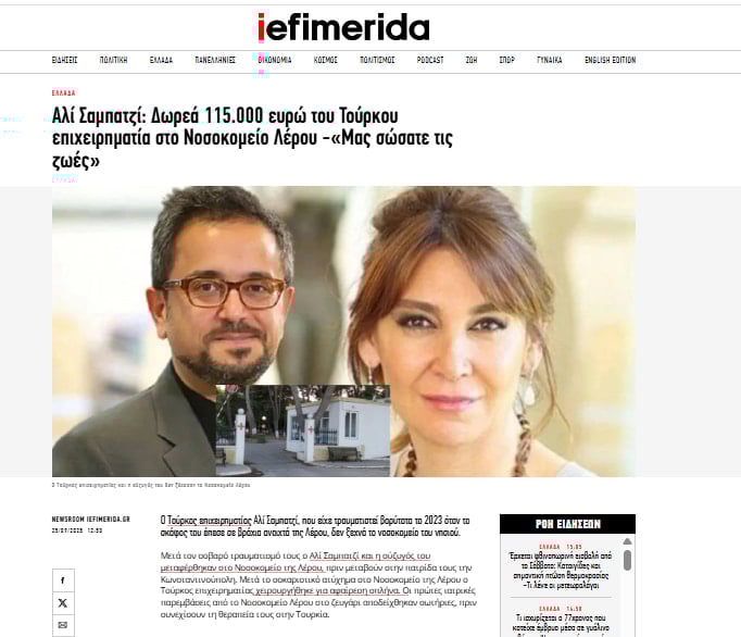 Yunanistan medyasında yer alan habere göre kazada ağır yaralanan Sabancı çifti, acilen Leros’taki hastaneye nakledilmişti.