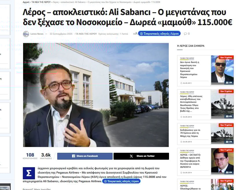 24 Ağustos 2023 tarihinde Bodrum’da tatilde iken Leros adasına eşi Vuslat Doğan Sabancı ve yatı ile ziyarete giden ve orada geçirdikleri tekne kazasında ciddi yaralanan ve ilk tedavisi Leros adasında yapılan iş insanı Ali Sabancı kazadan sonra ilk kritik müdahalelerin yapıldığı Leros Devlet Hastanesi’ne 5,6 milyon Türk Lirası (yaklaşık 115.000 Euro) bağışta bulunduğu ortaya çıktı.